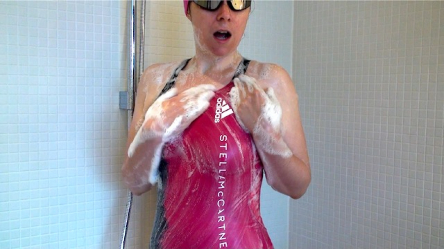 Na, macht dich das auch geil, wenn du siehst wie ich mir den Duschkopf unter den Anzug stecke...