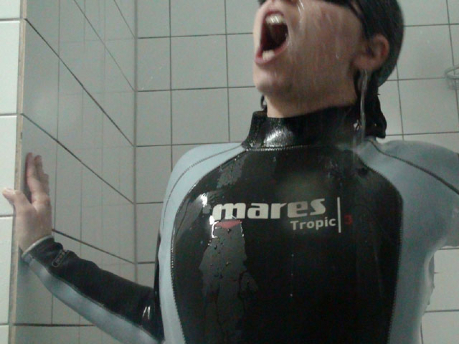 Auf Userwunsch habe ich mir einen meiner 3mm Tauchanzüge angezogen und bin dann mit dem Neoprenanzug unter die Dusche gegangen. Schon eine erregendes Gefühl mit dem glatten Neopren und dem Geruch dessen.