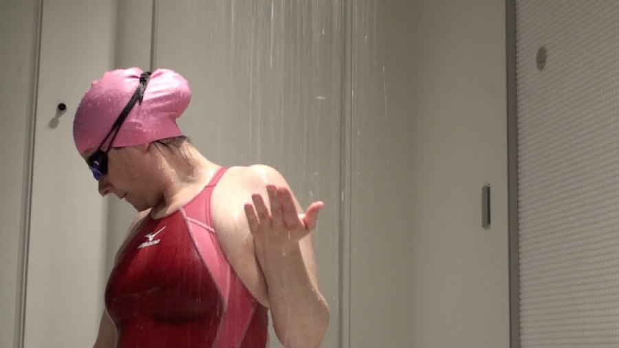 Ein Video für Liebhaber von roten Schwimmanzügen. Dafür habe ich einen glatten roten Mizuno Swimsuit aus Japan gewählt mit rosa Einsätzen. Dazu passend die rosa Badekappe.